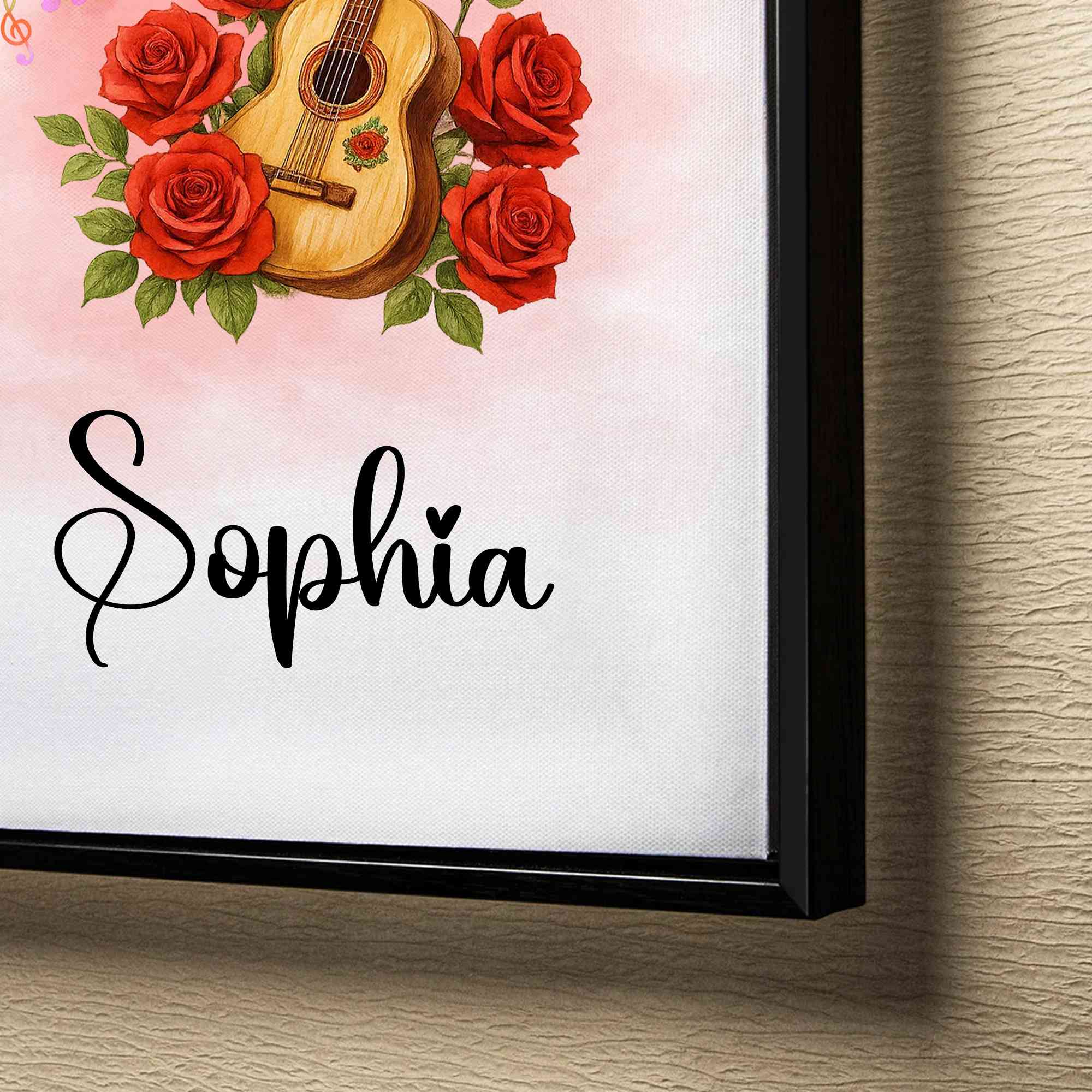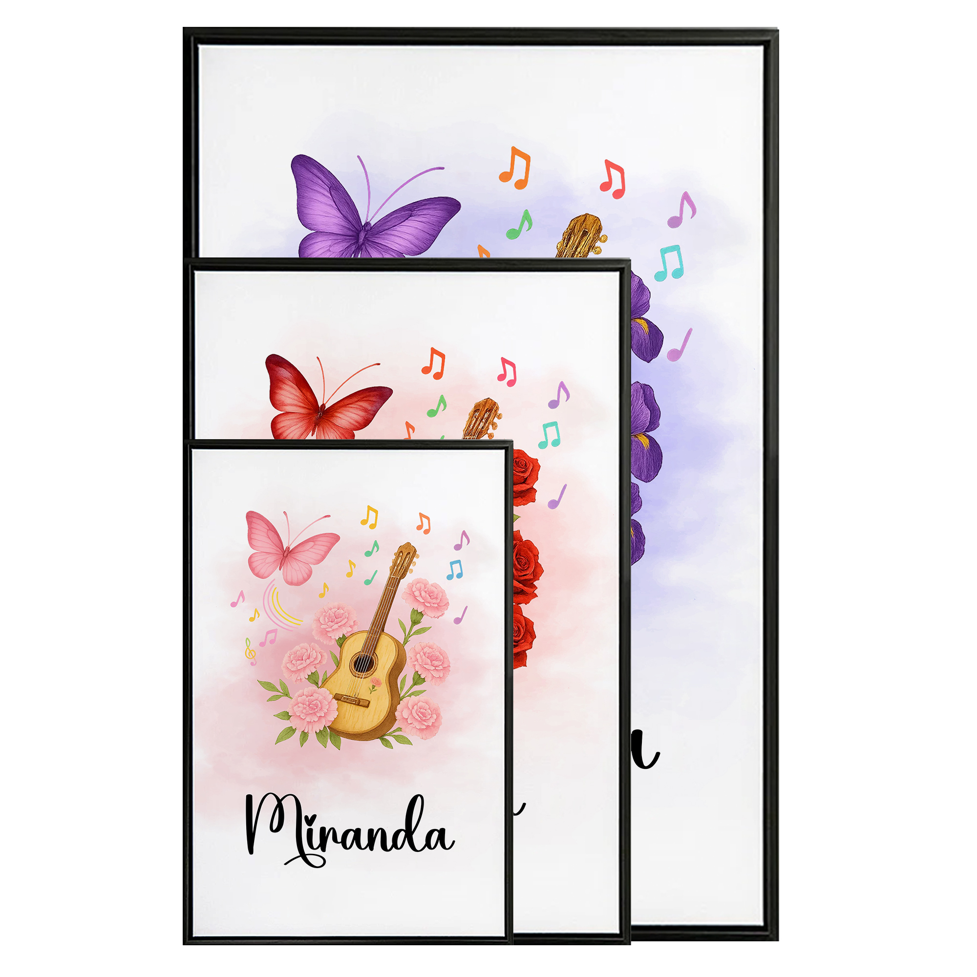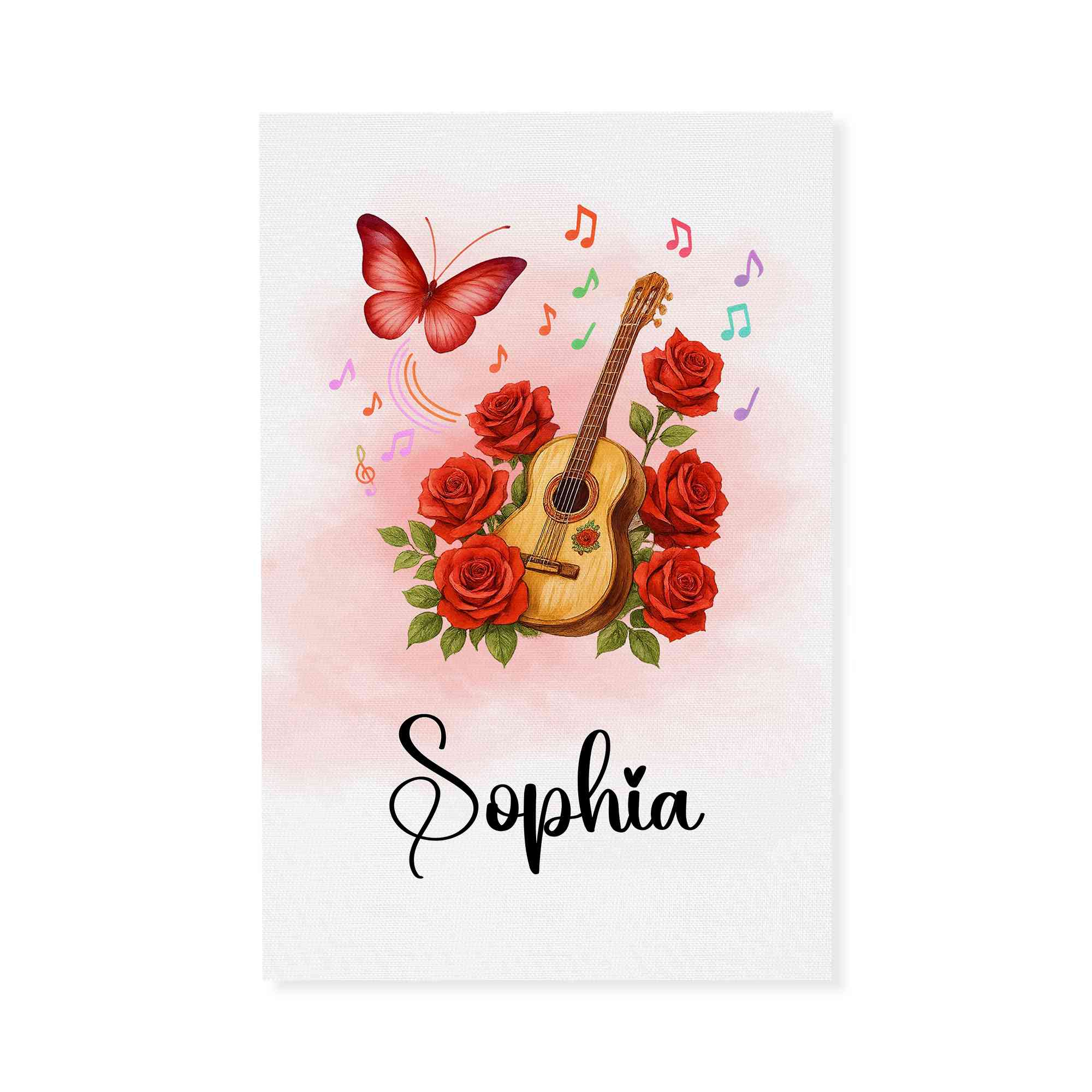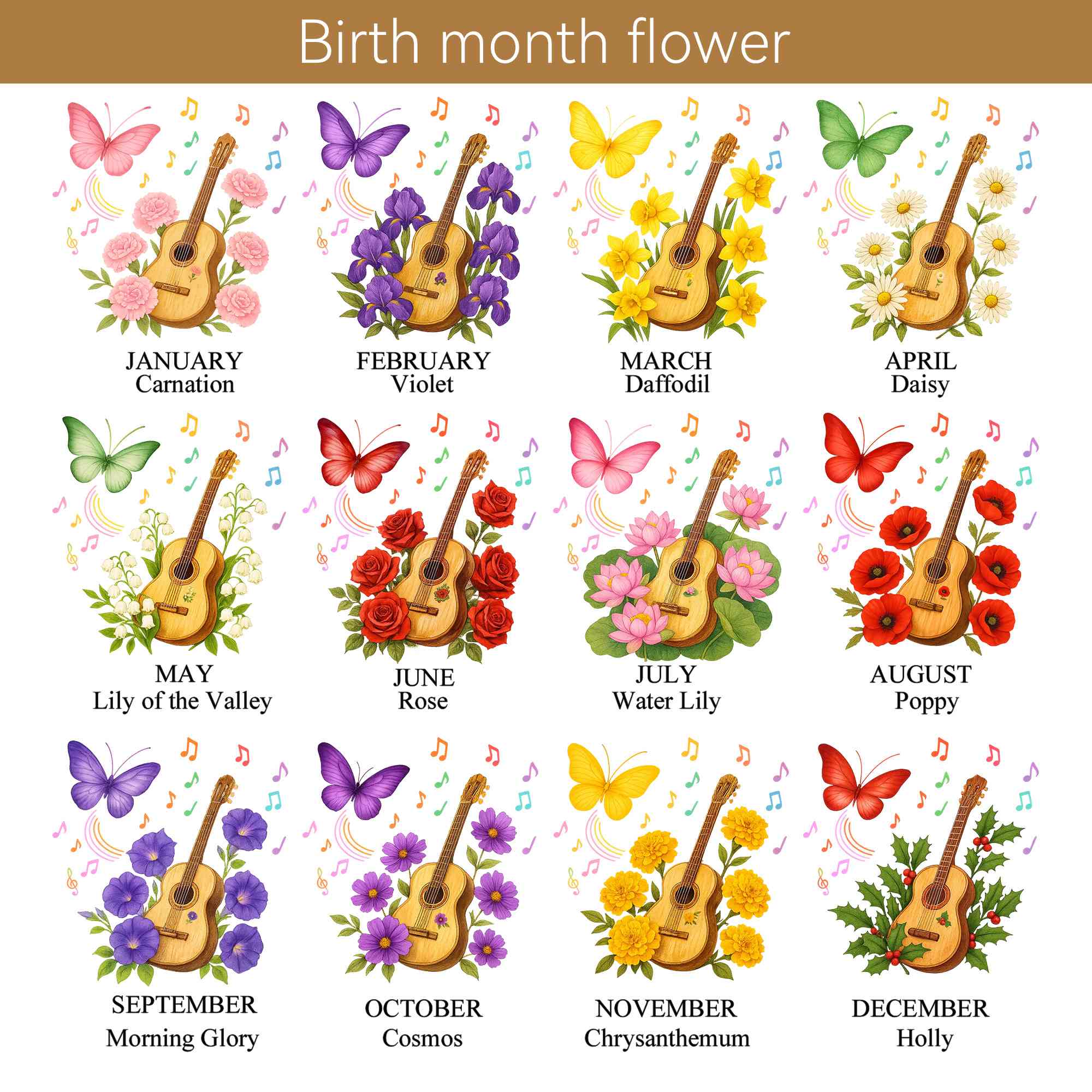 Personalized Musical Theme - This artistic painting highlights a guitar, birth flowers, a butterfly, and musical notes as its core motifs. The flowers representing your birth month are beautifully intertwined with a lively butterfly and flowing musical notation, blending the rhythm of music with the calm beauty of nature. The overall style is creative yet refined, radiating artistic charm without excessive decoration. Adding your name and birth flower brings a personal touch that reflects both your individuality and love for music.