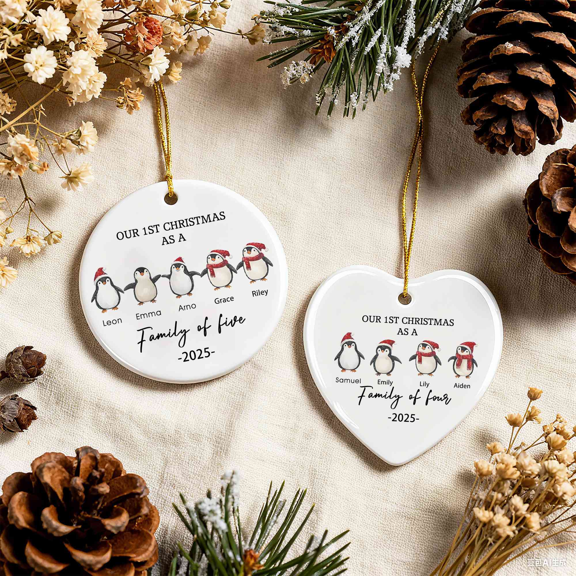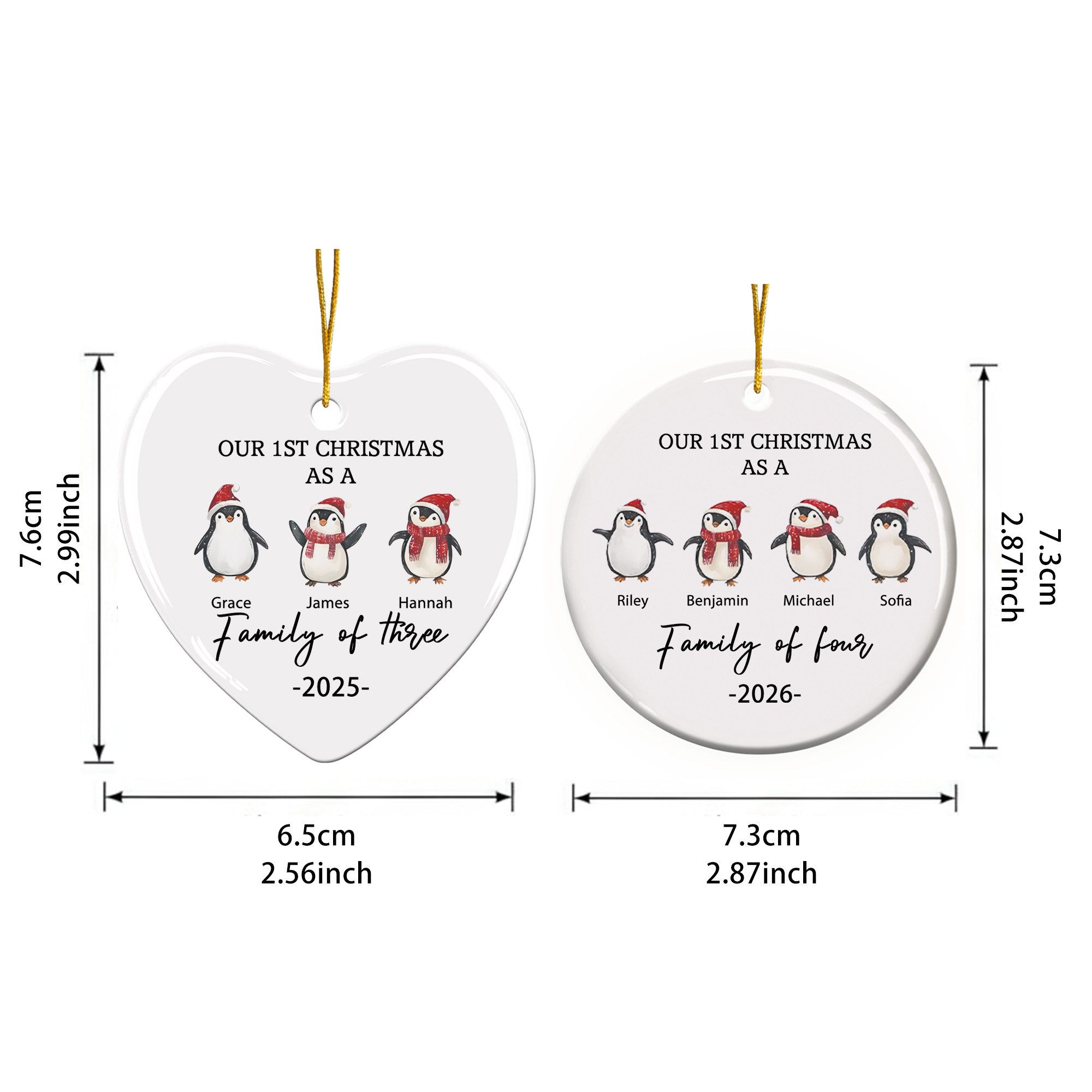 Custom Names Our First Christmas Penguin Family Ceramic Ornament, Heart/Round Christmas Tree Hanging Decor, Xmas Keepsake, Christmas Gift for Family