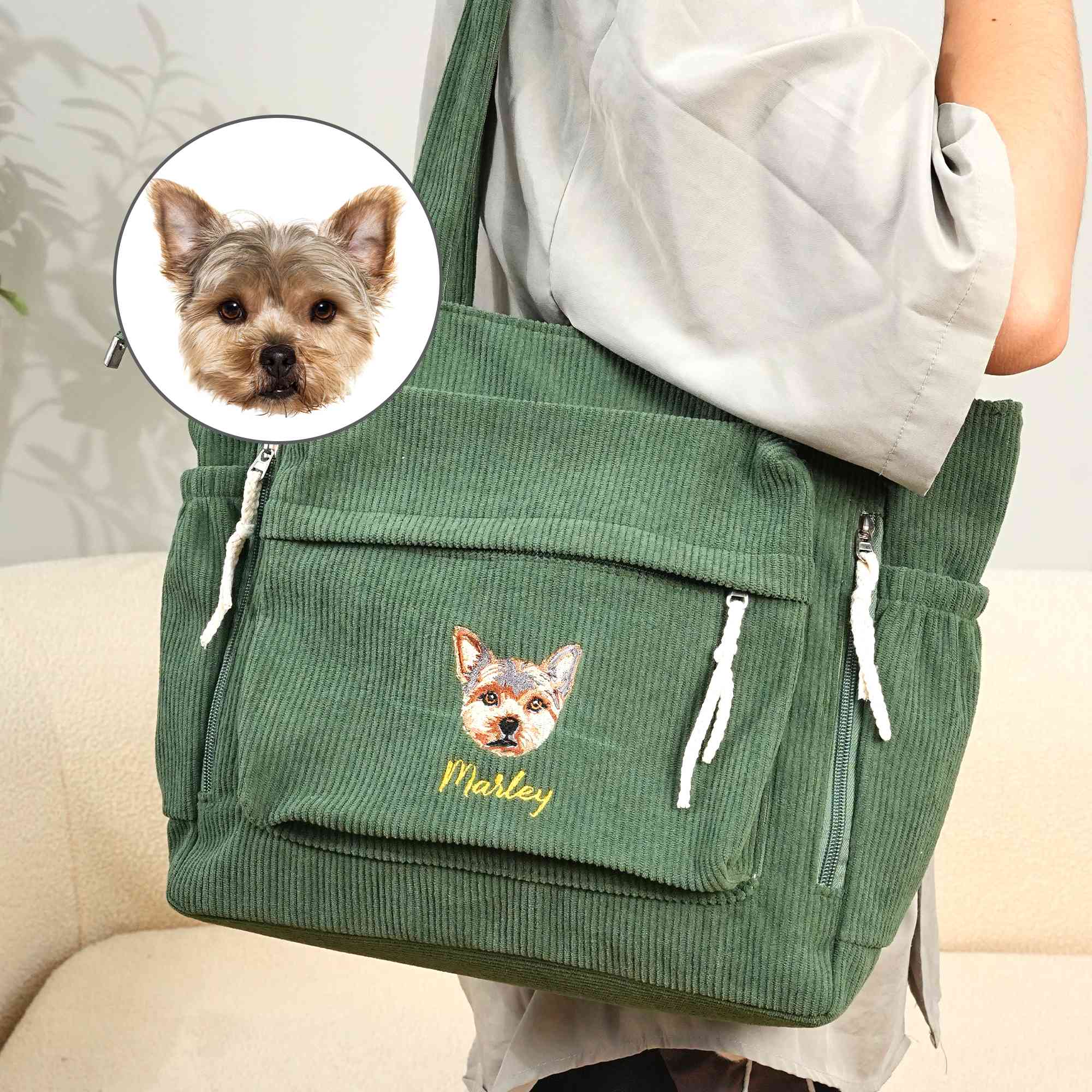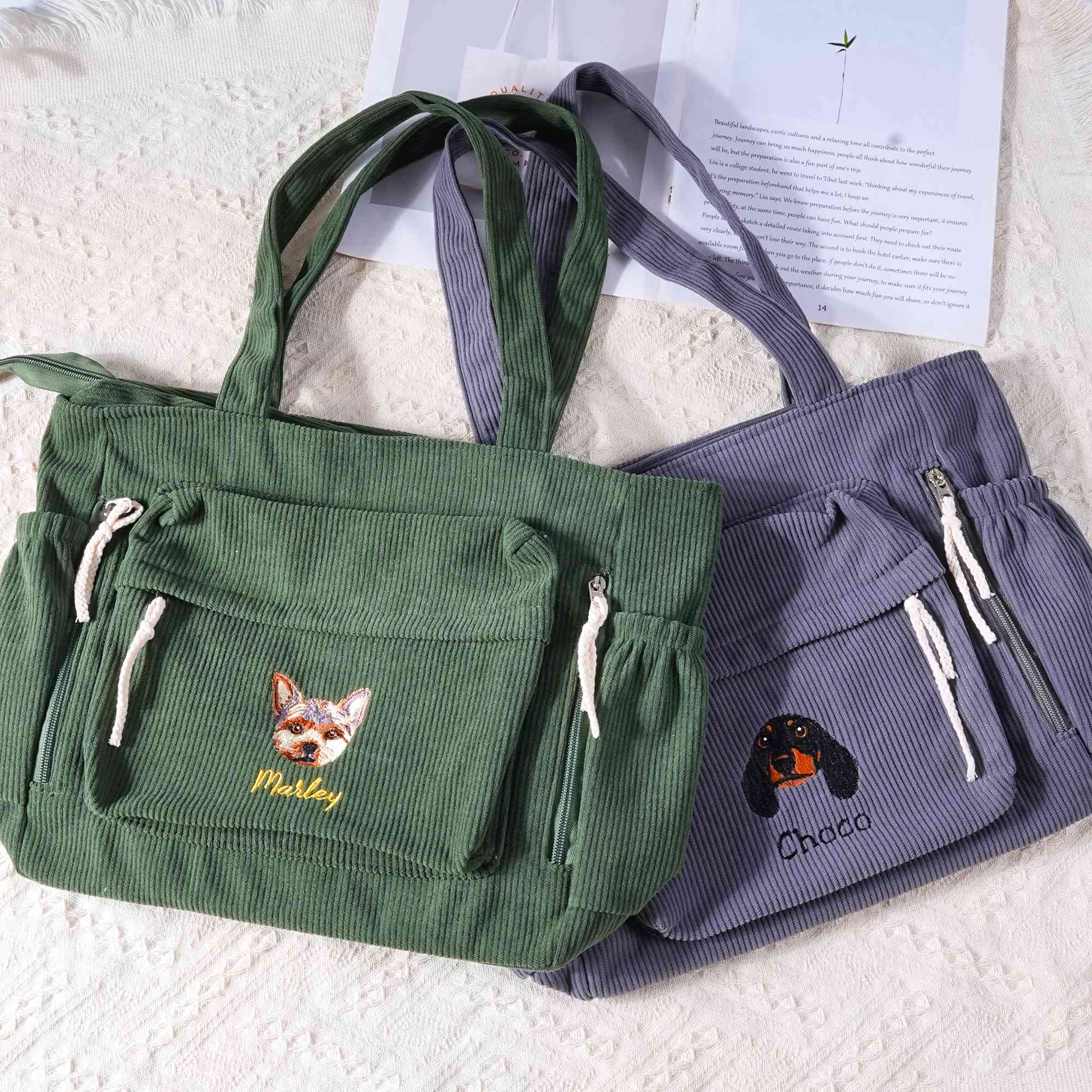 Personalized Pet Portrait & Name Embroidered Corduroy Tote Bag, Large Capacity Crossbody Shoulder Bag with Zippers & Pockets, Gift for Pet Lovers