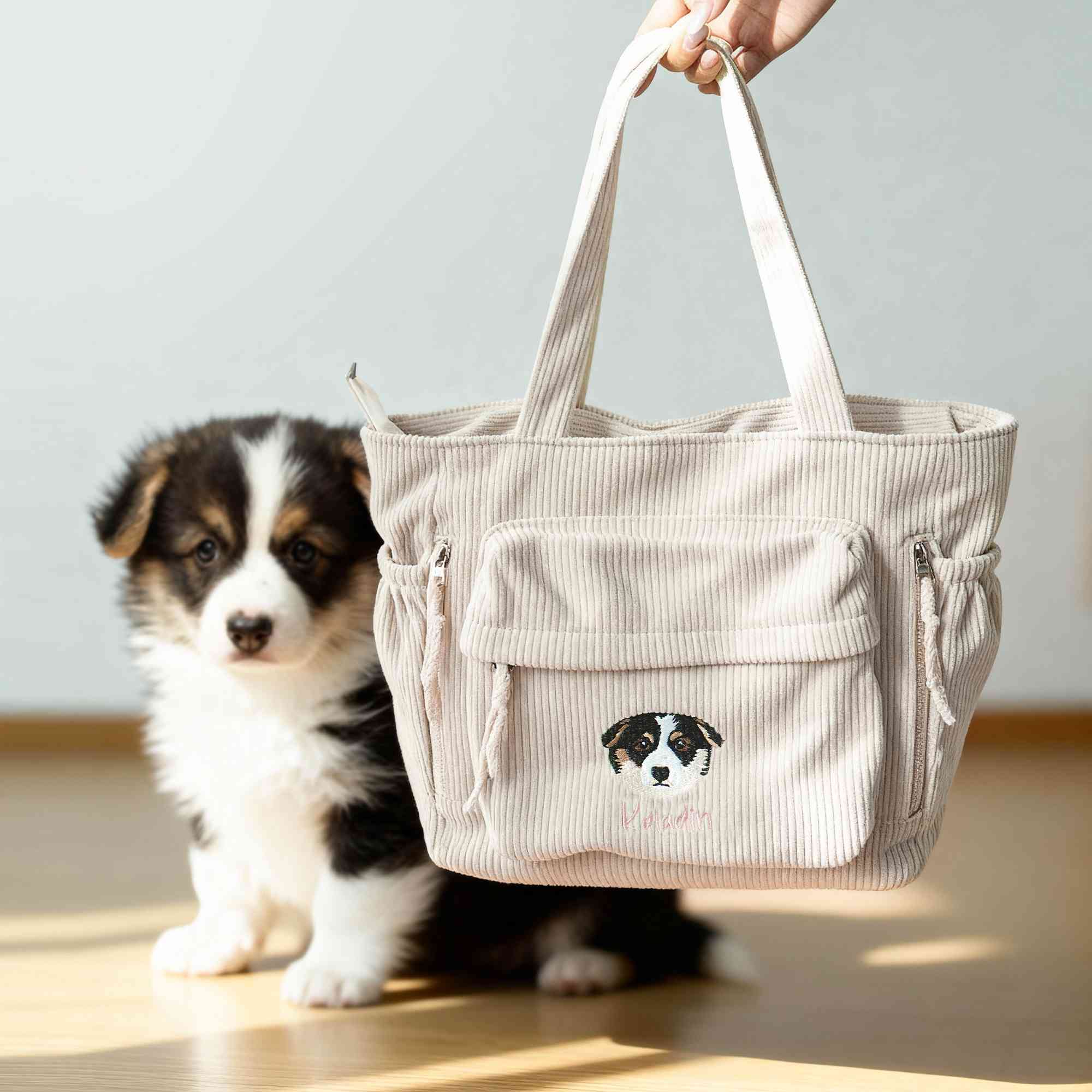 Style Personalized Pet Portrait & Name Embroidered Corduroy Tote Bag