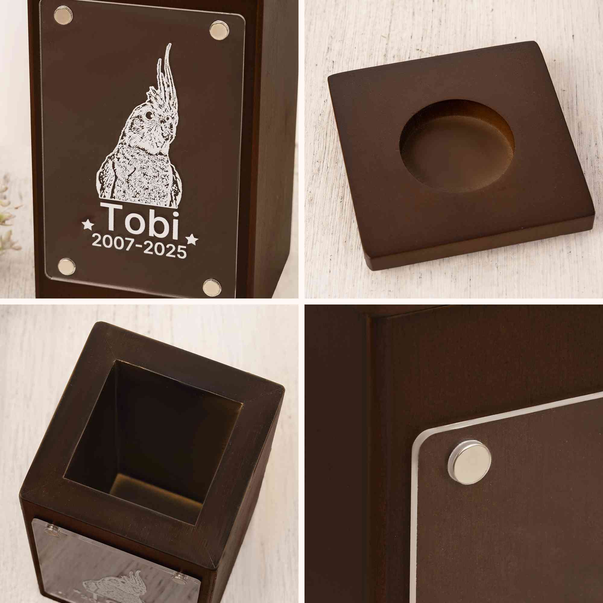 Custom Design - This elegant wood urn can be personalized with your pet's name and a cherished photo on acrylic, creating a unique memorial tribute to your beloved companion.